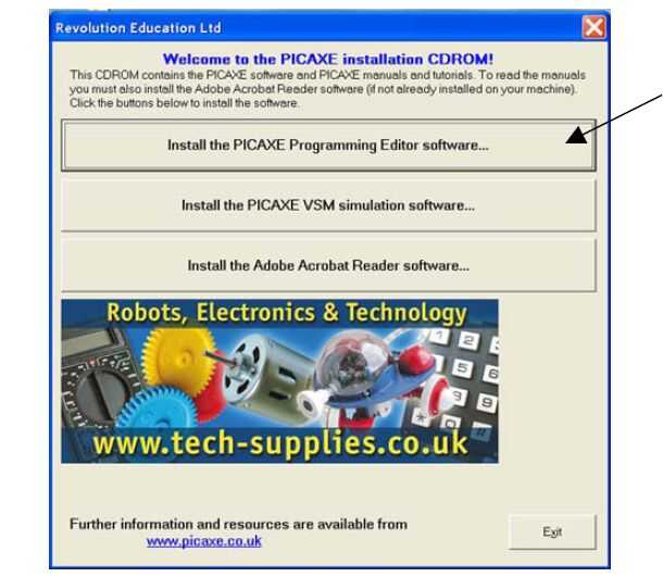 Instalar el Editor de programación de PICAXE del Snap circuitos XP o Snap-Micro me CD de software (Windows XP/Vista/7). El programa de instalación auto ejecución cuando pones el CD en la unidad. Haga clic en el botón grande que dice "Instalar el software Editor de programación de PICAXE".