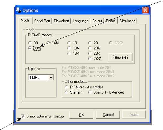 Diálogo de las opciones se abrirá automáticamente (si está marcada la casilla "Mostrar opciones de inicio"). Si no lo hace, vaya a ver > opciones. En la ficha modo, seleccione M 08--este es el microcontrolador PICAXE.