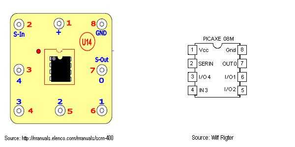 El bloque de circuitos de Snap (U14) que sirve como el portador PICAXE es especialmente marcado más fácilmente identificar los pines en el chip del microcontrolador PICAXE. Pensar en el chip como un error cuadrado con ocho patas. Hay una muesca en la parte superior para ayudar a orientar el chip y un pequeño punto marcas pierna 1. Las piernas y los pernos pueden a veces confundirse, pero en el bloque de U14 las piernas (y los broches correspondientes conectadas a las patas) están marcados en rojo 1-8 va en sentido antihorario. Las funciones de cada pierna están marcadas en azul.