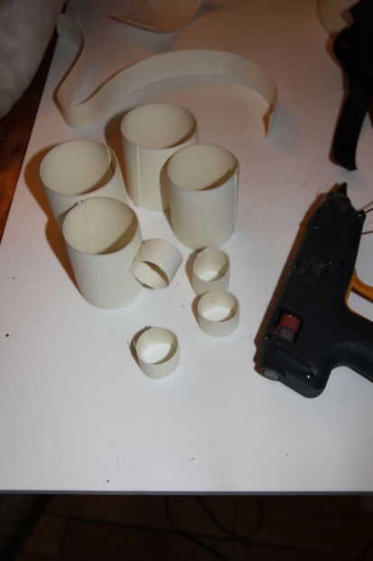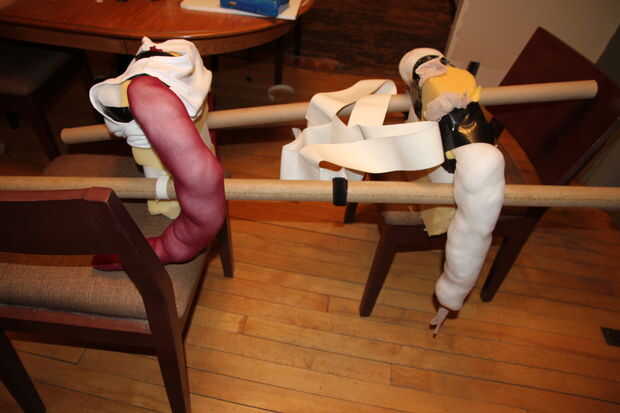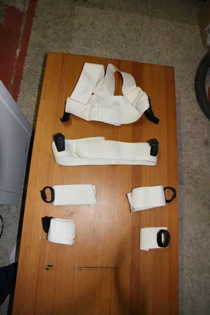 Entonces hice una serie de accesorios elástico de los postes horizontales que servirán como los controles principales para el movimiento del traje. Las bandas elásticas están hechas para los tobillos, rodillas, caderas y torso. Las bandas tienen pequeños lazos a los lados exteriores de cada uno. Hice el mismo tipo de elásticos para mí, excepto que eran capaces de fijarse con Velcro, y el accesorio para los polacos también Velcro reforzado. Esto es para que puedo acceder y me quite el traje para el transporte etc.. Hice una cruz atrás corto arnés de mi torso, ya que es donde la mayoría del peso se suspenderían por.