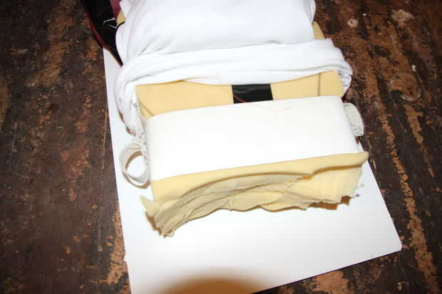 Comencé por crear los cuerpos de mis amigos bailando. Los torsos son cuñas de espuma de tapicería a medias rellenas con guata de brazos y piernas. Las piernas más bajas también son espuma de tapicería para darles más forma, mientras que los muslos superiores son de bateo para la flexibilidad. Ligan las rodillas y codos con nudos así.