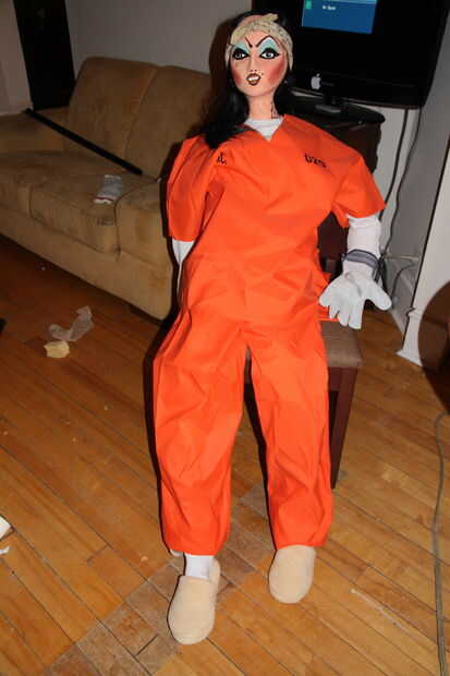 En este punto, todos los accesorios elásticos deben ser forrados para adaptarse a los cuerpos relleno en los puntos que corresponden a su propio cuerpo. Varios ensayos de prueba de preparación son para que se seque todo encajo. Fui a la ciudad con cinta adhesiva y pegamento caliente para fijar los elásticos a los cuerpos. Luego vistió los cuerpos y cortar los agujeros en la tela donde estaban los lazos. Los 3 pies de largo postes podrían entonces ser deslizados aunque los lazos y permanentemente (otra vez cinta). Até las manos enguantadas y poste por último así como la espuma de poliestireno pintado dirige fueron caliente pegar/pegado a los torsos. Pude dar un paso en el centro del traje, entre los polos y luego fijar mi lazos de Velcro en los puntos en los polos.