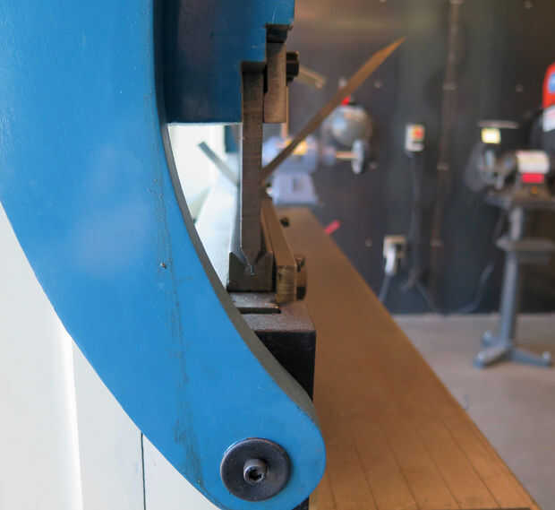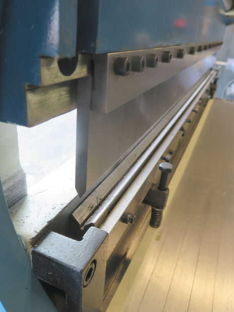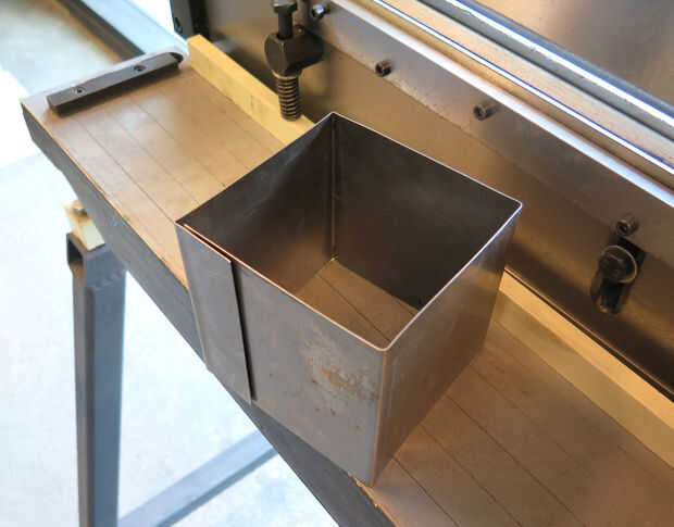 El freno en el Baileigh tiene dos partes: un troquel inferior ranura en V que se mueve hacia arriba y hacia abajo con la cizalla y un rack de dedos que empujan la hoja en el dado. Los dedos son removibles para dar lugar a bordes doblados adyacentes. Esto es excelente para la fabricación de cajas, pero tenga cuidado de su diseño para asegurarse de que se forma en y ser removibles de la máquina de prueba.
