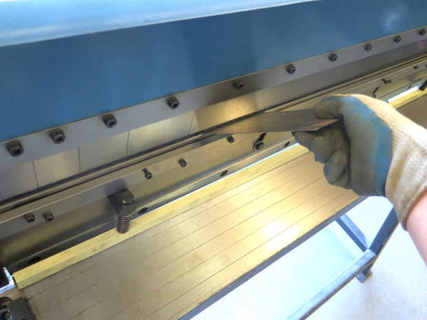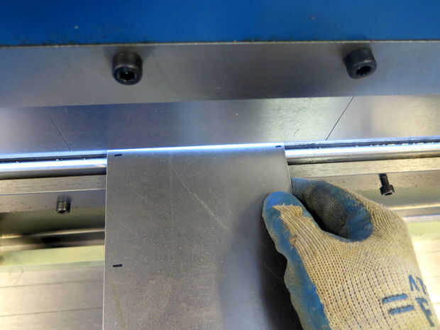 Puede utilizar la guía ajustable detrás de la máquina para establecer una parada, pero es más fácil y más confiable para marcar el material y mantenerlo bajo los dedos de frenos en las marcas. Nota: no hay ninguna cerca de 90 grados para asegurarse de que sus curvas son perpendiculares a una arista; usted tiene que usar su marca o marcar una línea.