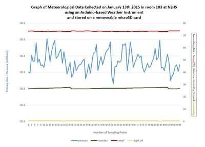 Después de ver los datos generados por nuestro instrumento de tiempo utilizando el código de ejemplo decidimos inspeccionar y modificar el código. Eliminar líneas de código para sensores no instalados en nuestro instrumento y cambió la tasa de recogida de datos a 1 punto cada 10 segundos (sobre todo a prueba y error proceso de edición). El archivo adjunto a este documentos de paso nuestro Código revisado.