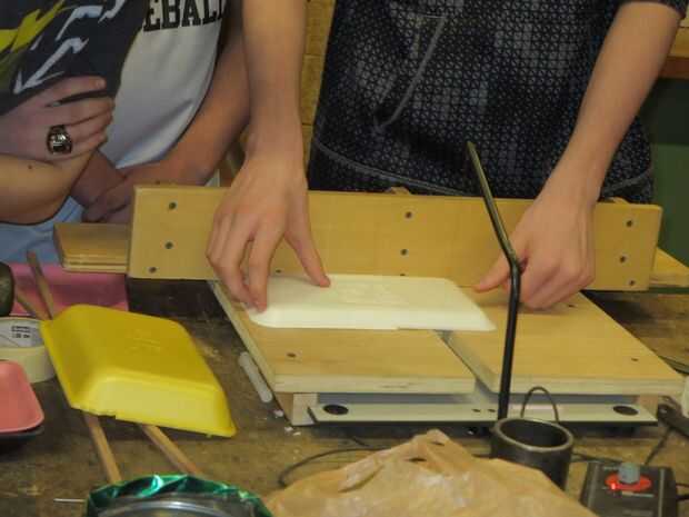 La mayoría de nuestros materiales de construcción fueron encontrada en el depósito de chatarra en nuestra carpintería. Cortar madera con una sierra de contornear y piezas con un alambre caliente de la espuma. Compramos varios tipos de pegamento, incluyendo cianocrilato (superglue) pegamento del gorila y gorila Superglue, con ataduras de cremallera. Todas las piezas fueron dry fit antes de pegar por lo que puede ser montados fácilmente. Algunos equipos intentaron espuma para las aletas, otros utilizan cartón. La regular pegamento había derretido la espuma de poliestireno y el pegamento gorila regular tardó demasiado en conjunto. Tuvimos nuestro mejor éxito montando todo el material con pegamento del gorila.