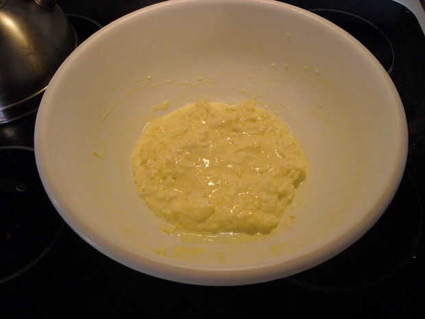 En un tazón grande, combine los huevos, el queso crema y el queso parmesano y mezclar bien con un tenedor o espátula. No te asustes si la mezcla se ve muy húmeda y líquida, se endurezca como hornea.