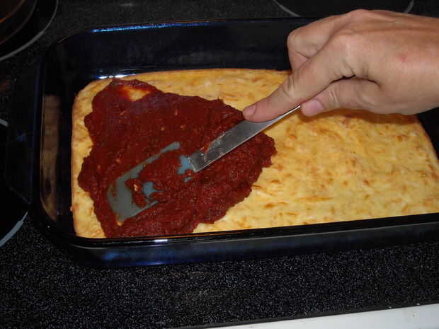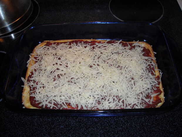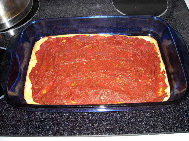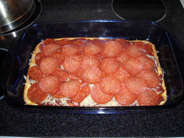 Extender la salsa sobre la corteza, luego añadir los ingredientes de su elección. Una buena cama gruesa de mozzarella todo lo ayuda a permanecer juntos. Cubrimos la pizza con un montón de pepperoni.