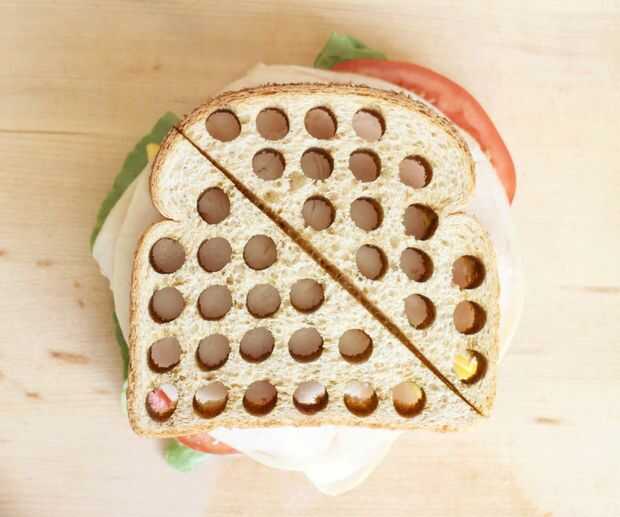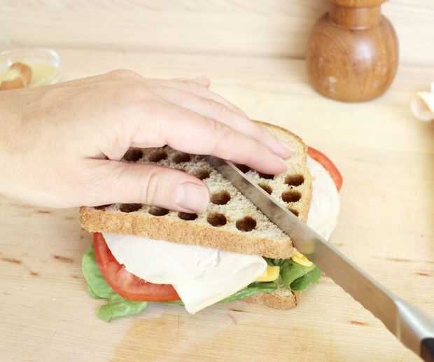 Cuando llega el momento de hacer el corte, suavemente presionado ambos lados de la torta y coloque el cuchillo de sierra en el corte diagonal de arranque. Corte suavemente a través del resto de la pieza superior y cualquier ingredientes callejeros. Luego asegúrese de que su cuchillo se reúne con la diagonal línea de corte sobre la pieza inferior también.