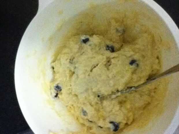 6. Vierta los ingredientes húmedos (Lite blanco leche y huevo) que se encuentran en una jarra en la mezcla bowl bruja contiene los guiones seco (harina llano/integral, puré de plátano (puré) y arándanos), al verter, verter poco a poco y apuntar el líquido en el pozo de los ingredientes secos