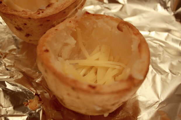 Coloque una pequeña cantidad de queso en el fondo de la patata.
