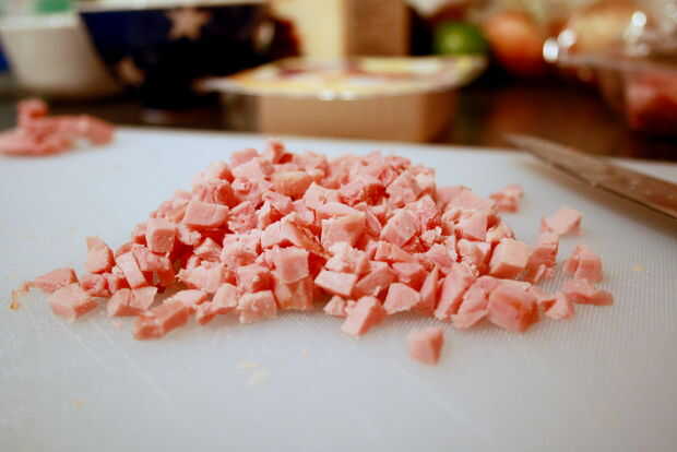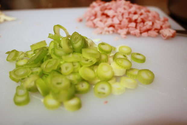 Ahora para los rellenos.  He utilizado jamón ahumado y cebolla de primavera tan finamente en cubos el jamón en rodajas la cebolla de primavera y freír la cebolla (sin aceite es necesario que tengas una buena sartén antiadherente).