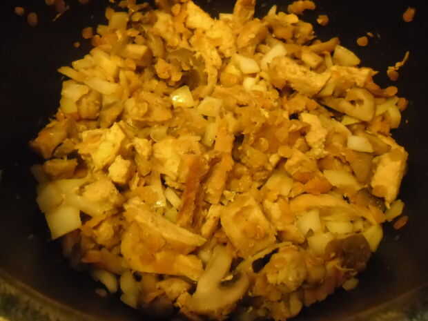 Una vez que el pollo esté cocido, lo cortar en pequeñas tiras de trozos. Poner en una cacerola junto con las lentejas, la cebolla, en rodajas los champiñones y un chorrito de agua.