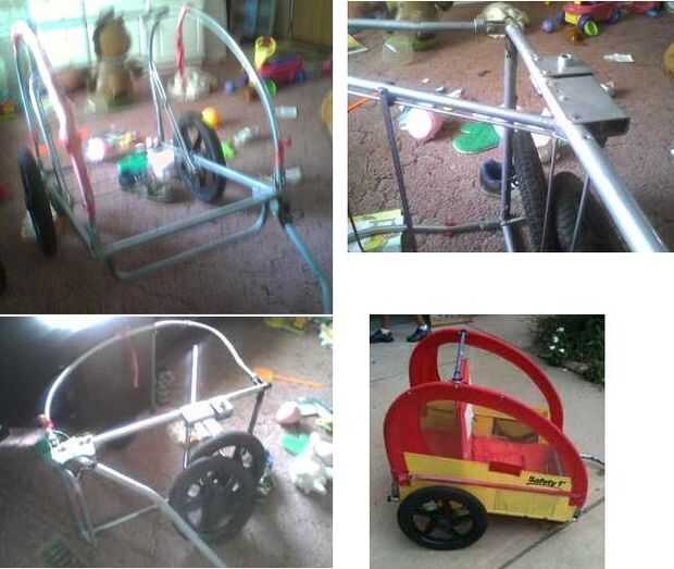 Hacksawed fuera el asiento y los soportes al y había reciclado con latas y chatarra.