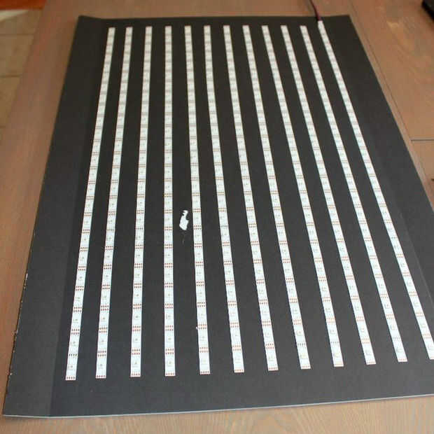 En la segunda pieza del tablero de la espuma, trazar las tiras de LEDs. Una vez que has hecho tus marcas, pelar el forro de las tiras y aplicarlos cuidadosamente a la Junta. No se puede quitar fácilmente.