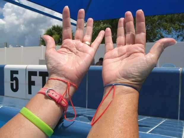 Poner una de las bandas alrededor de su muñeca con el nudo hacia el interior y para que su banda Unido cuelga libre. Lo mismo para la otra muñeca. Esta es la posición de cero desde el que se iniciará el conteo.