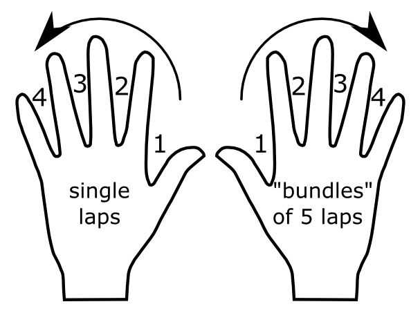 Uso mi mano izquierda para los más, mi mano derecha para los 5 años y desde mis pulgares como se muestra en la figura. Realmente no es importante que las manos/puntos de partida que utilizas como puede recordarlo y estar cómodo con él. Aunque este sistema es bastante sencillo, te recomiendo intentarlo hacia fuera sobre tierra seca primero para no distraer a los socorristas.