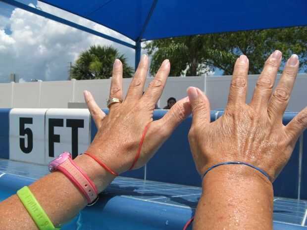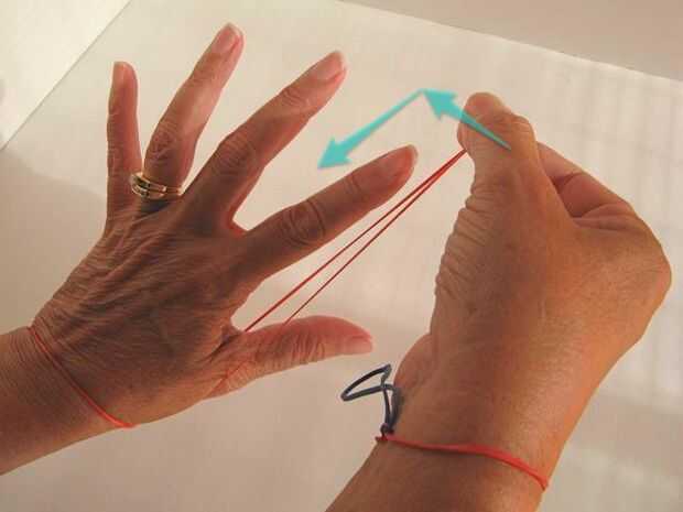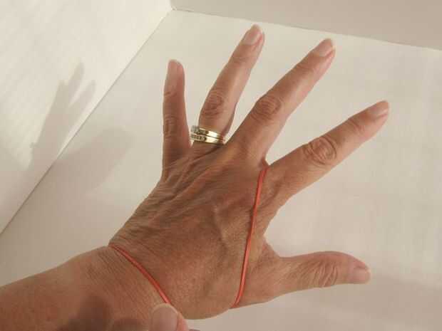 Después de completar su primera vuelta, tomar la banda colgando en su muñeca izquierda y lazo en el pulgar izquierdo. (Vistas frontales y traseros que se muestra a continuación.) Después de la segunda, terceros y cuarta vueltas, incrementar la cuenta moviendo la goma por un dedo (cada uno más lejos el pulgar). Después de 4 vueltas la goma será entre el meñique y el dedo anular.