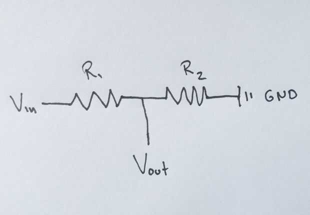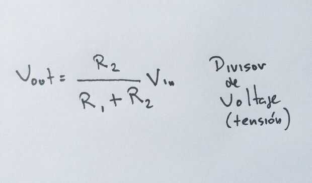 En la foto se muestra el circuito. Como ven, son dos resistencias una después de otra. Por un lado se conecta la corriente de entrada Vin, y por el otro la tierra GND. Justo en el medio de las dos resistencias se conecta un cable, y de allí el voltaje de salida es una fracción viene dada por la fórmula que ven en la foto sigue.