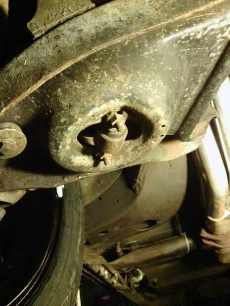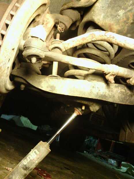 Una vez que estos dos tuercas se quitan Deslice el choque de la parte inferior del brazo de control inferior como esta