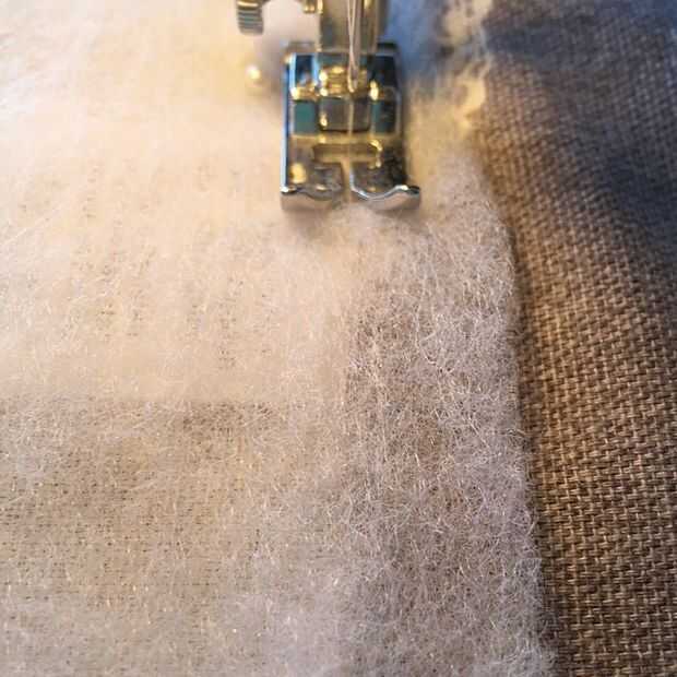 Después de que el bateo se une agarras tu panel de cortina que esta uno de los espejos y no tiene velcro. Coloque el panel de cortina en la parte superior el bateo con el lado incorrecto tocar el bateo. Línea de las costuras y los bordes y el lado izquierdo, parte superior y derecha del perno.