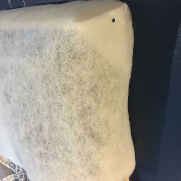 Una vez que tengas todo cortado está listo para fijar la guata a la madera. Pone el bateo a la madera con el borde golpeando la pared. Vas a envolver las esquinas exactamente como un regalo. La grapa el borde de la esquina de bateo y el borde superior de la espalda junto a la pared.
