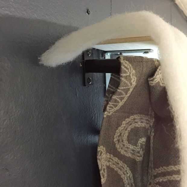 La tela necesita doblar por la mitad y plancha muy bien. Entonces Fije la misma forma que el bateo sólo asegúrese de que los bordes toquen la pared y cuelga el doblez.