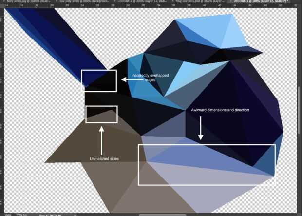 Ahora buscamos errores. En particular, vaciar espacios donde olvidó rellenar o bordes donde los triángulos no se reúnen adecuadamente. También corregir las áreas donde no sientes los triángulos ir por el camino correcto.