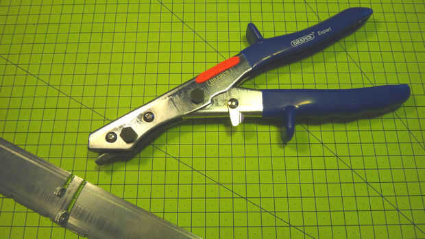 Las recortadoras de chapas - de Amazonas - permiten mano-corte de chapa hasta 2 mm de espesor, de alrededor de $15-$25. Aparte de ser muy seguro de usar, que también permiten que usted consiga en pequeños rincones o incluso hacen un cuadrado de agujero redondo. Incluso si tienes herramientas que hacen el mismo trabajo, podría decirse que estos dan gran control.