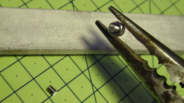 4. Tome el tornillo con unos alicates y el borde áspero de archivo de. Cuando plana, trabajo en un movimiento circular para conseguir un borde ligeramente redondeado en todo el camino.