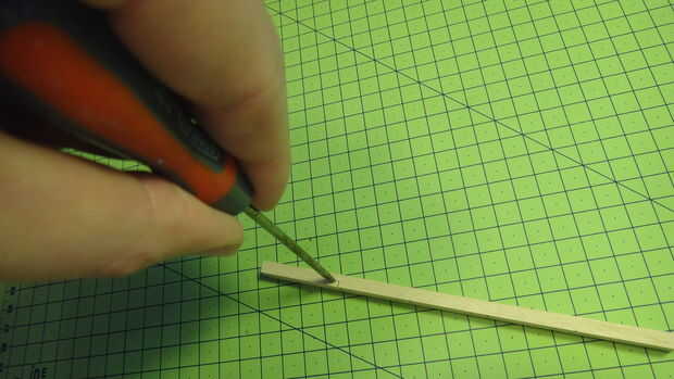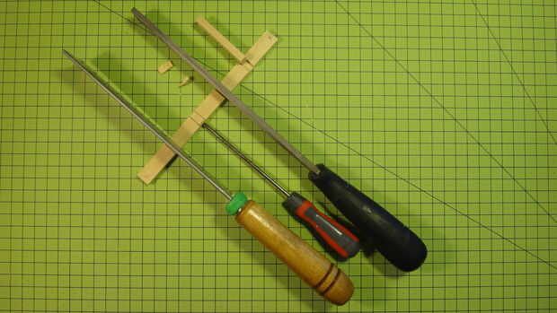 4. ahora tome un cabeza plana Destornillador un poco más pequeño que el espesor de la ranura a cortar. Coloque en la parte superior y golpee el mango con la mano. El se astillaría a rápida fácilmente. Poner un trozo de madera debajo para proteger su mesa. Es sorprendente qué tan rápido es este proceso, pero hacer práctica en un pedazo primero!
