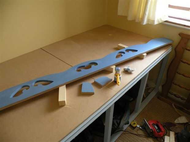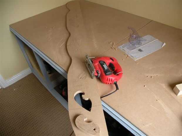 Después se cortan todas las formas de utilizar una lijadora de mano para el MDF y un router eléctrico para la parte superior de la tabla de la curva de la arena.