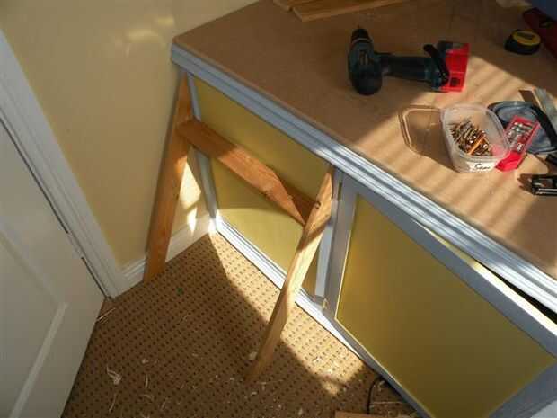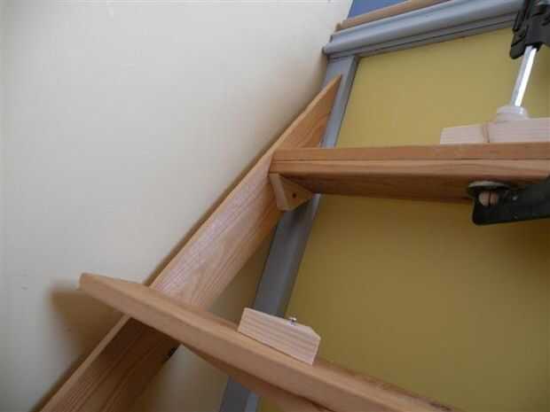 Después de toda la madera está marcada Perfore orificios piloto y uso tornillos largos para unir los pasos. Después de que la escalera esté seguro a su lugar y pequeño añadir el soporte de madera pequeña izquierda overs de la puerta de la corte los ángulos del marco. Pegamento y tornillos bajo los apoyos de todos los pasos. Pintura y asegúrelo en su lugar.