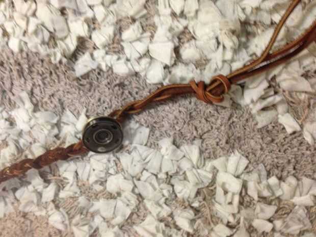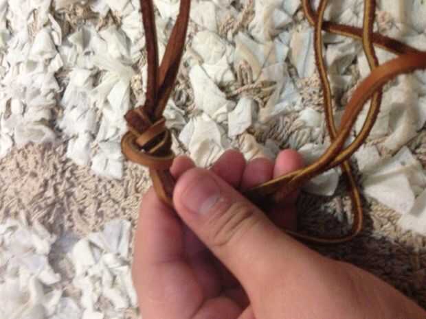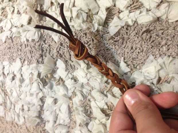 Tomar tres piezas de cuero alrededor de 12-13 pulgadas si la muñeca es alrededor de 8-9 pulgadas y atarlos juntos. A continuación empezar a trenzar hasta llegar a un punto donde quieres poner el encanto/encantos. Terminar de atar los hilos juntos.