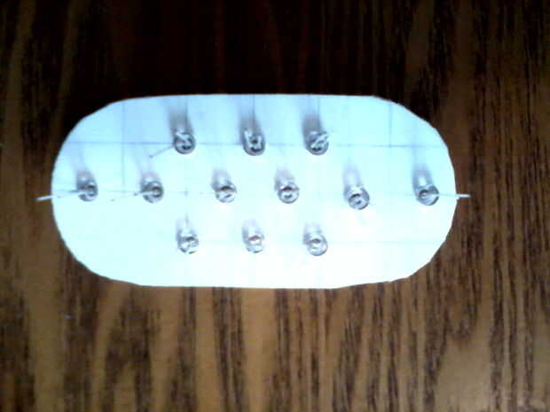 Luego perforar una línea de 6 agujeros hacia abajo en el centro del óvalo plástico blanco