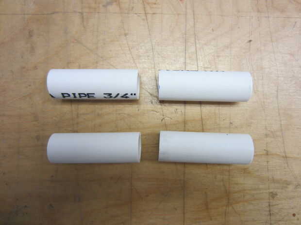 - Corte dos 3 7/8" longitud del tubo de PVC como se muestra en la segunda foto. Estas piezas son las armas que los apoyarán el carrete.