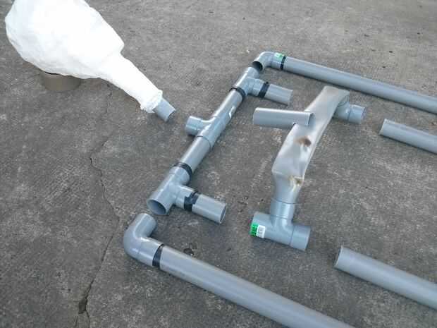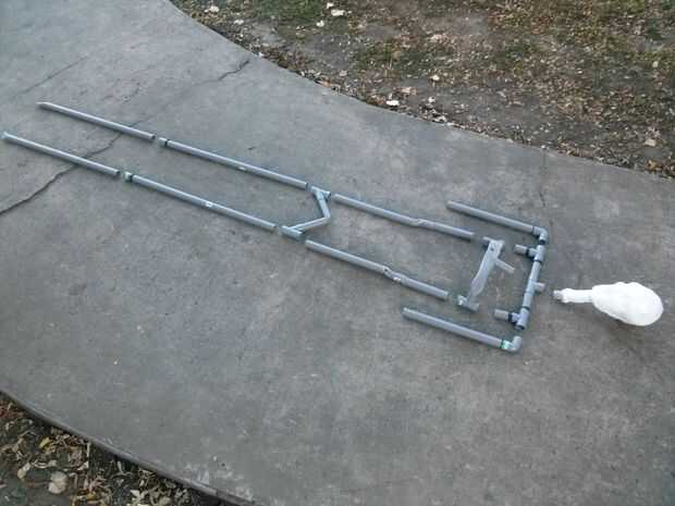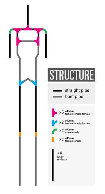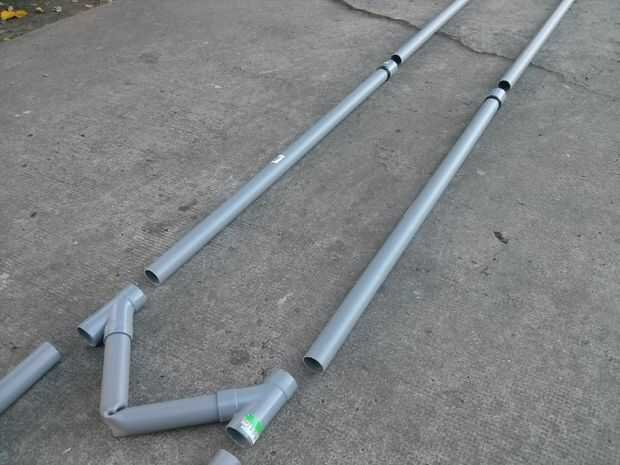 La estructura se hace enteramente de las juntas y tubos de PVC. Barato, fácil de cortar, bastante robusta.