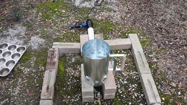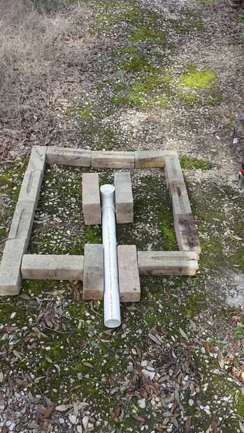 Ahora que tiene su perímetro de ladrillo creado y está centrado en el tubo, establecer ladrillos para elevar y colocar el encendedor para chimenea de carbón centrado con el Bicks y el codo de PVC.