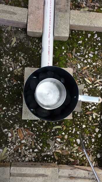 Antes de encender el fuego, colocar la taza del acero inoxidable (crisol) en el centro del horno. Coloque el carbón alrededor del borde de la taza para calefacción nivelado. Después de todo es encender el carbón y esperar el carbón a una quemadura constante.