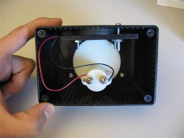 Instalar amperímetro poniendo a través de los orificios de la caja y colocar las dos tuercas de montaje. También Conecte los cables de la célula solar al amperímetro, conectar el cable negro de la célula al polo negativo del amperímetro marcados con un símbolo negativo. Cerrar el cuadro de atornillar en el panel posterior.