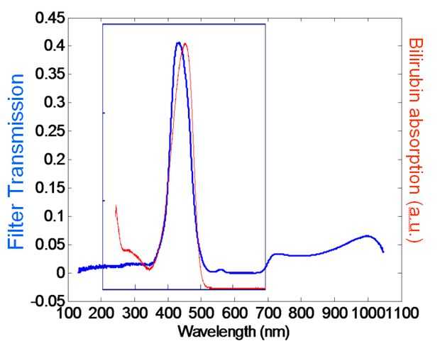Filtros-los filtros de cristal azul de iluminación asociados Pegasus fueron seleccionados debido a su espectro de transmisión coincide estrechamente con el espectro de absorción de la bilirrubina. Dos se utilizaron para disminuir aún más transmisión de luz no-terapéuticos. Además, 34mm redondo filtros encaja muy bien con la célula solar seleccionada. Sería posible comprar cristal azul a granel de una compañía de suministros de arte y cortar las piezas necesarias para su uso, aunque el espectro de transmisión del vidrio se debe medir primero. El diagrama muestra el espectro de transmisión de la configuración de doble filtro con el espectro de absorción de bilirrubina overlaid.