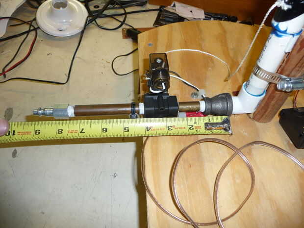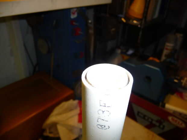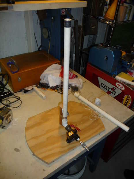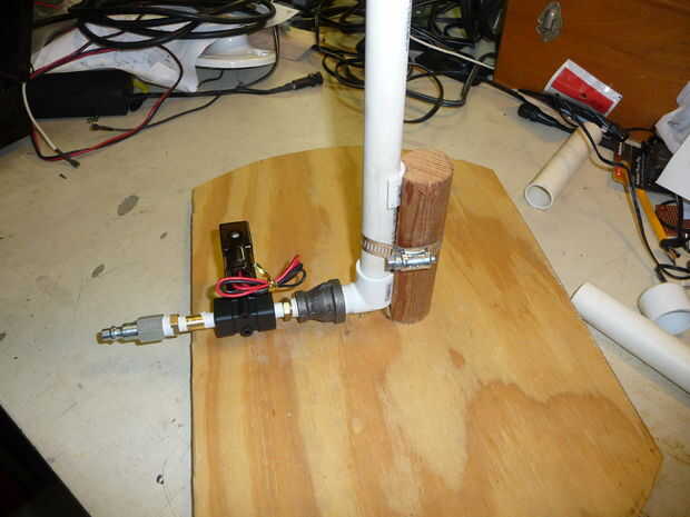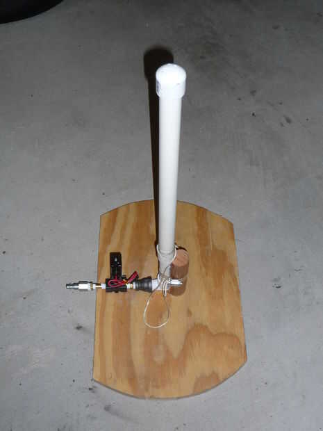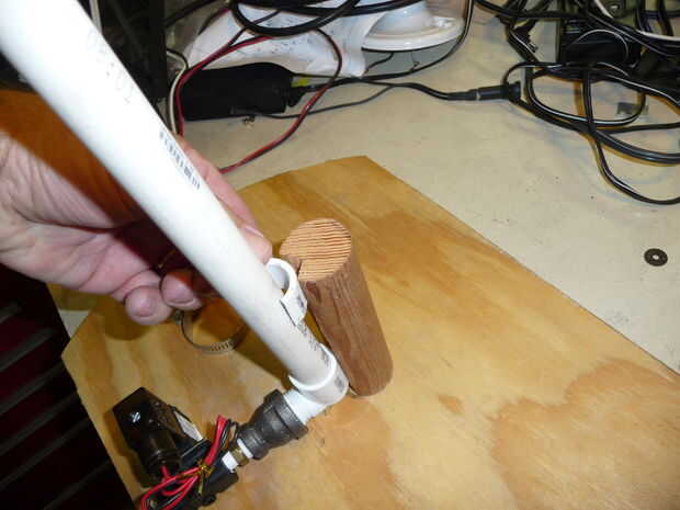 Glue the PVC into the elbow. Coloque la unidad contra la ranura en V del fuerte (espiga de madera) con el codo hacia abajo contra la madera. Coloque al espaciador que hiciste en el paso 6 entre el PVC y surco del fuerte regreso cerca de la parte superior de la ranura. Pegue esto en su lugar. Ahora coloque la pinza automotriz sobre el PVC y el fuerte detrás. Ubicarlo entre el codo y el espaciador de apriete. Deslice el PVC sobre la PVC y Compruebe la parte superior y verifique los 2 son casi nivel. Si no, recortar uno o el otro hasta que estén. Luego pegar la tapa de PVC sobre el PVC. Si usted es el tipo de ansiedad, el sistema ahora puede ser probado, pero se advierte que el PVC se lanzará como un cohete (bueno tal vez Instuctable otra?).