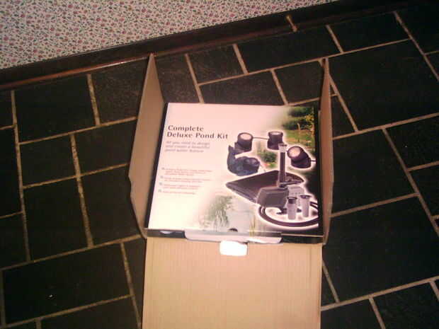 Kit de 1 estanque. Incluye una bomba y un filtro mecánico, 3 luces subacuáticas, 12'X 9' forro del estanque, un pequeño pez que escupe agua y 3 cabezas de fuente diferentes. Paga $79 en mi local almacenar Meijers. Si planea agregar peces a tu estanque, necesita un "biofiltro" para quitar los residuos de pescado. Este filtro sólo filtra las partículas grandes, no bio-materia.