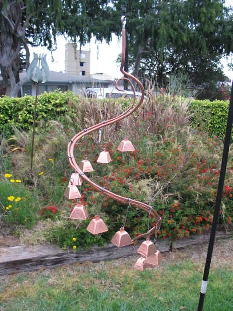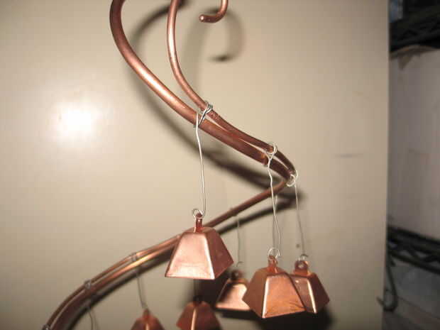 A continuación I parte formado en la tubería de cobre en la espiral deseada y luego doblar el alambre 10gauge a la misma forma básica. Debe haber aproximadamente 10" desde el agujero superior hasta el extremo superior de la tubería. Dio vuelta la espiral en hacia el centro más y luego agregar las curvas para colgar la campana uniformemente. Como veis en la foto el cable sólido se curva en cada extremo para un mejor aspecto decorativo.