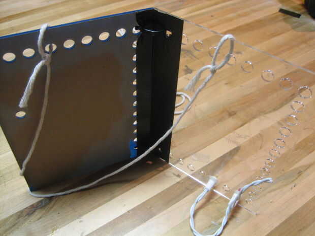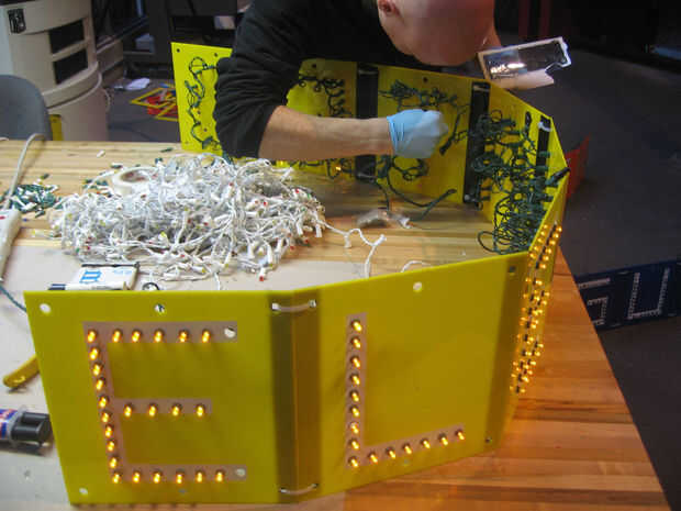 Disposición de las cartas que necesitas para crear tu palabra. Firmemente con cinta adhesiva cada letra junto con una tira de cinta adhesiva en la parte posterior de la muestra. Encaje por lazos de alambre a través de los agujeros de fijación en el diseño. Por último, lazo longitudes de cuerda de algodón o nylon de carga > 70 lb a través de los orificios provistos en las plazas de la carta. Usted necesitará dos cuerdas adjunta a la parte superior de la señal para colgar y dos a cada lado para tensirla. Había conectado un cable de extensión a uno de los cables tensores y alambre-atado en lugar de alivio de tensión.