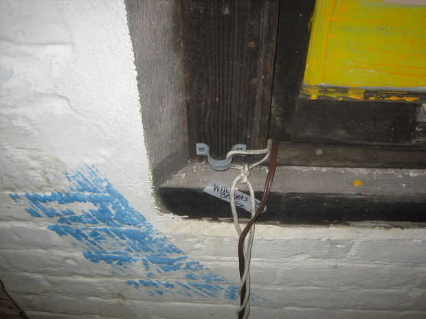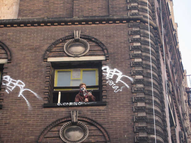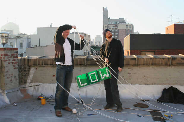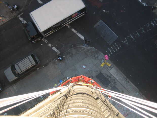 Esto dependerá de tu situación particular y la arquitectura. Para colgar nuestra señalización torre de asesor de seguridad nacional, comenzamos por obtener acceso a la azotea del edificio vela en primavera 11. Hemos decidido colgar los signos individualmente así más fácilmente verticalmente podríamos espacio cada palabra. Bajamos cada letra, comenzando con el más bajo primero, sobre el lado del edificio. Una vez que la señal estaba a la altura correcta, utilizaríamos un Sr. Longarm poste telescópico de pintura con un improvisado gancho en el extremo para asir el bucles longitudes de cable cable y extensión a ambos lados del signo. Tiró de las cuerdas de tensión a través de la ventana más cercana en la fachada del edificio y ligan a los soportes que tenemos instalado en el interior del edificio.