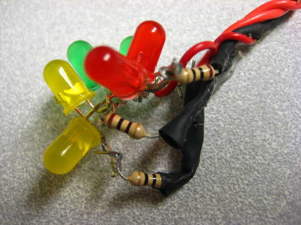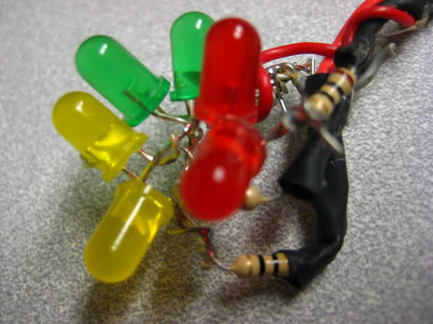 Mi LED se aparean tales que cada color es iluminado por dos LED. Para ello, conecte el conductor de 'en' (cortas) de cada color juntos y usar un resistor de bajo valor antes de conectar al Arduino. Conecte el cable de tierra (más) de todos los LED y conectar a tierra en el Arduino.