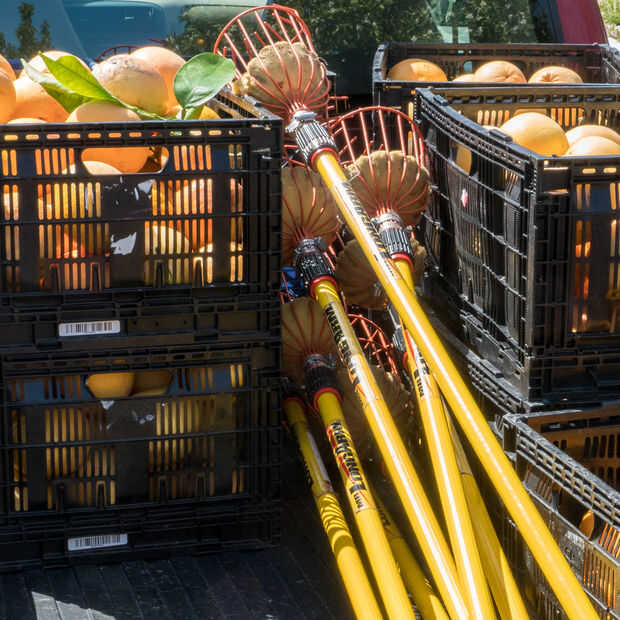 En aras de la divulgación completa, utilizamos unos 250 fruta cosecha polacos. Hace tres años compramos cien Sr. LongArm postes. Cuando el Sr. LongArm se enteró acerca de nuestro trabajo, contactó con nosotros, y son ahora uno de nuestros seguidores y han donado generosamente 125 polos al proyecto. Los polos que ves aquí son un regalo de Sr. LongArm.