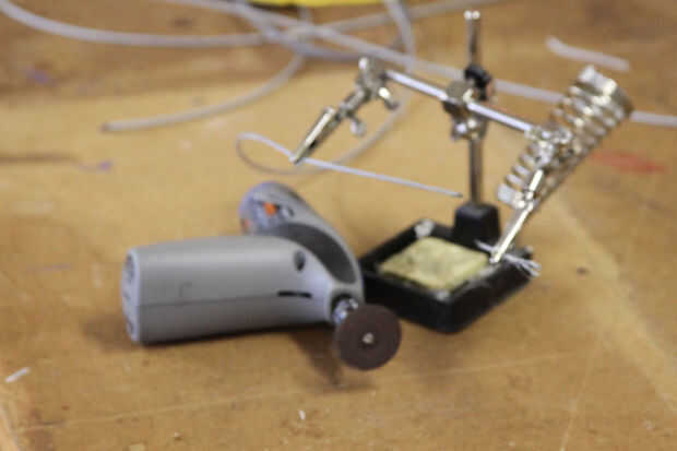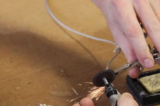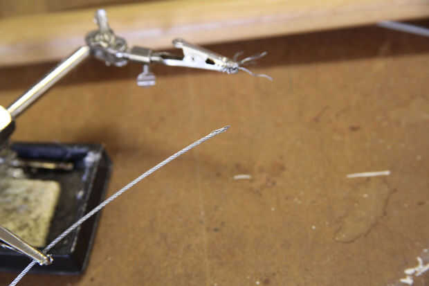 ~ 5 pulgadas de la capa de un extremo del cable de la tira. Usted necesitará hacer esto en secciones de dos pulgadas. Al remover la capa, el extremo del cable puede ser raído que hará que sea difícil de pasarlo a través del cuello y tina/hardware. Si esto sucede, utilice la herramienta dremel con la broca de la lijadora de disco para cortar la sección deshilachada. La amplia sección de la broca de la lijadora de disco puede utilizarse entonces para dar forma y afinar la punta del alambre, que le da un agradable final puntiagudo que será fácil de hilo.