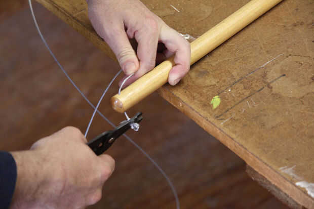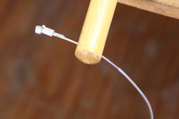 Un agujero en el extremo del cuello utilizando el taladro de 3/32 broca en su herramienta dremel (o perforación). La sección de pelado del cable a través del orificio en el cuello del hilo de rosca. Fije el cable con el hardware de cable: hilo a través de una sección de la abrazadera de doble cañón, a continuación, la parada, luego por la otra sección de la abrazadera de doble cañón. Encrespadura de la virola por ligeramente la mangling en varios puntos con los dientes de su pelacables (o utilizar a un arrugador real si tienes uno). Esto hará que el casquillo Presione firmemente hacia abajo en el cable, sosteniendo la cuerda en su lugar.